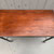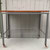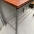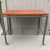 De tafel heeft een grijs metalen frame en een houten tafelblad.