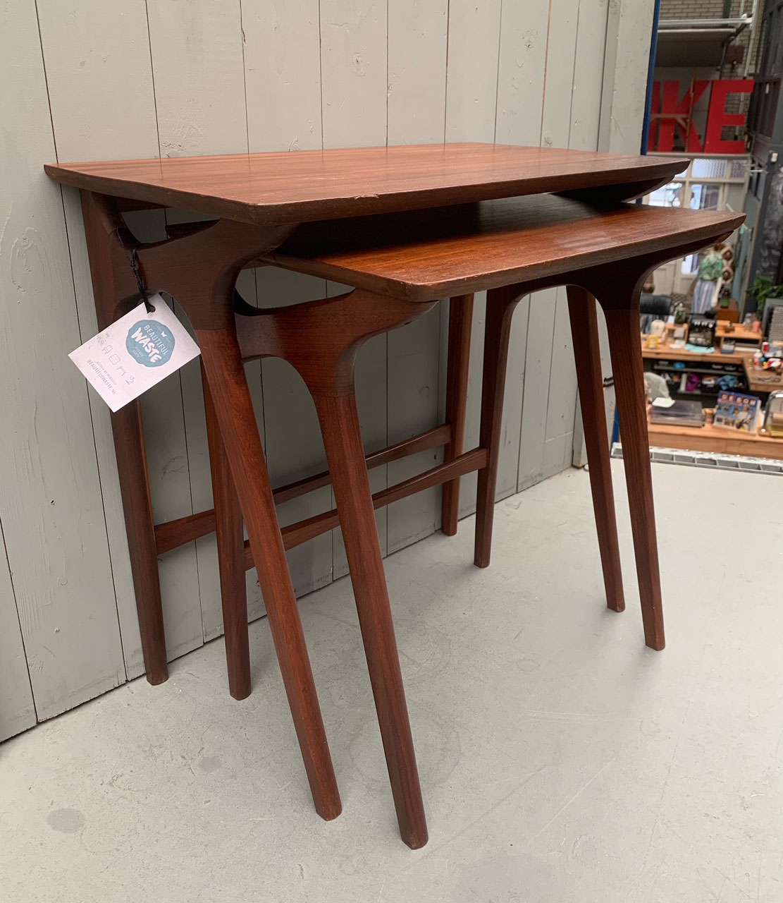 Mimiset van twee mooi gevormde houten bijzettafels.
