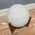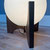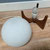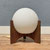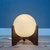 Een bijzondere houten tafellamp, de Raak Hokusai D-2022, met wit glazen bol erop.
